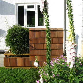 Reclaimed western red cedar shingles then wrapped around the tank and on to form a screen for bins. A border was made with piled high topsoil which should never be thrown away. It gave rise to a self-seeded bed of opium poppies and other flowers that shook with happy bees.